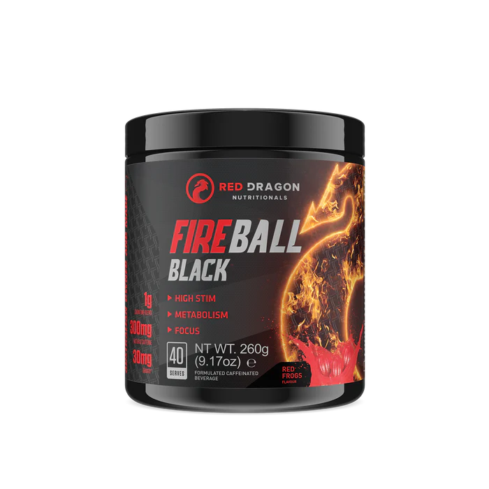 Fireball Black Thermogenic by Red Dragon Nutritionals 40 Scoops Fireball Black, through synergy and clinical doses creates a one-stop shop for torching those unwanted fatty stores. Fireball Black provides hard-hitting energy, mental clarity and an increase in thermogenesis, and GBBGO® to keep carnitine levels elevated for longer.